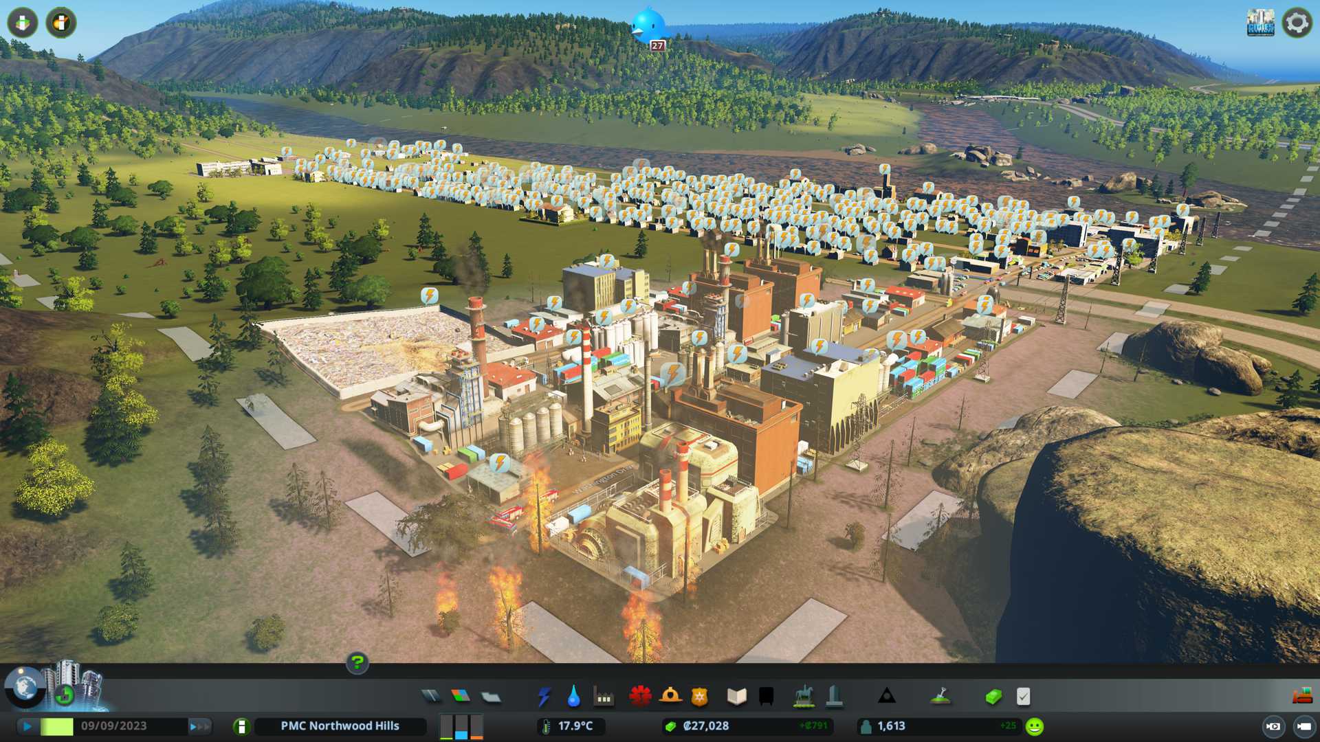 While I was away from keyboard, you could sum it up that my city burnt down. First there was a water issue, I was using water towers which were within the industrial zone pollution range and now water supply got polluted, people started to get sick and ground across the neighborhoods polluted by the water. Then if this was not bad enough, we have a forest fire started by industrial building and that burnt huge swath of area.