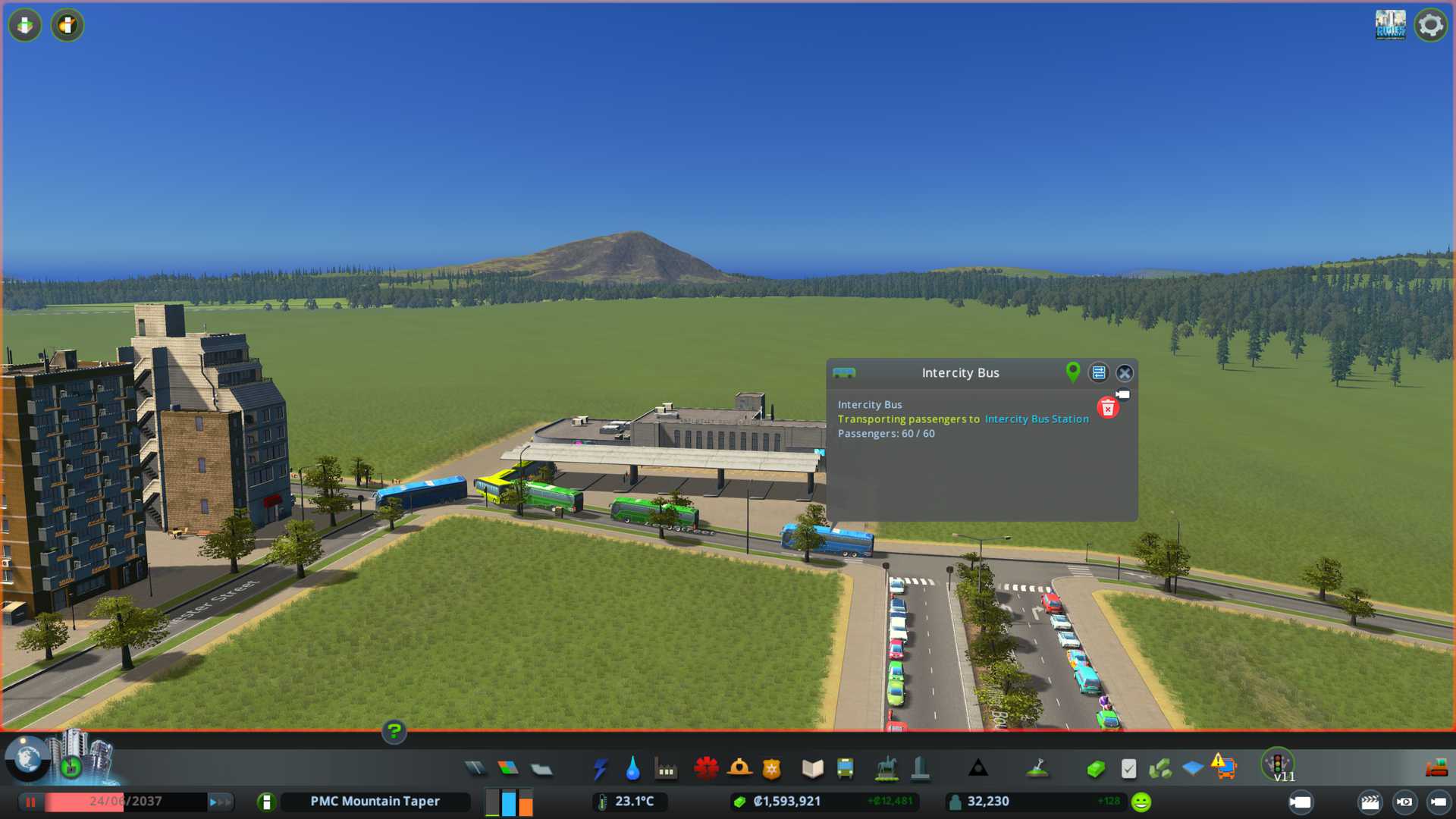 Great to see intercity buses arrive with 60 people on-board, that is many many private cars off the highway connection into the new residential area. Great building / service, wonder why I never used this before. With this and passenger train terminal, there will be no such traffic issue like I had with previous savegame with large zoning.
