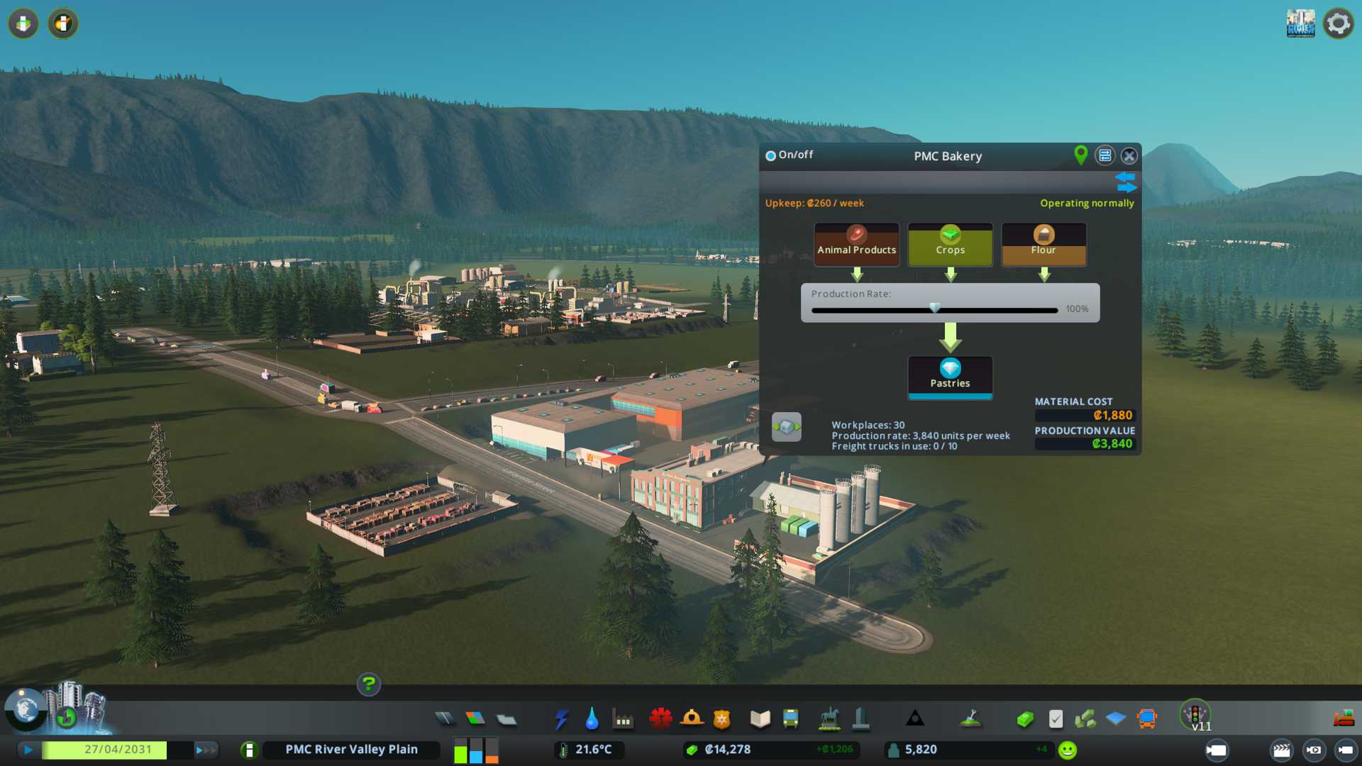 2022-08-27T02:41:00Z Purchased Clothing Factory, requires animal products, crops and plastics. Production rate 6,400 units per week.