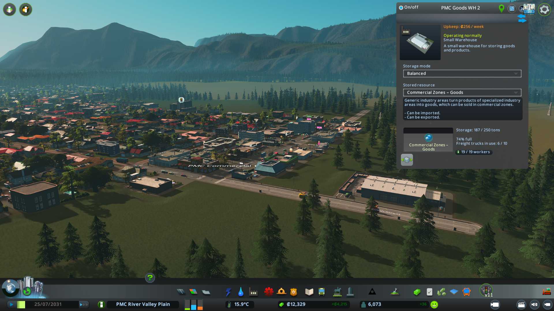 Also purchased small warehouse yard (as it just fit into one road grid nicely), storage mode metals and no outside connection exports.