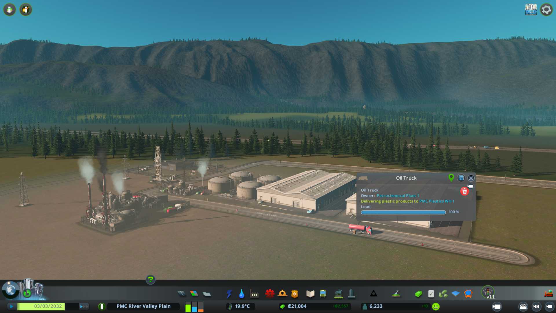 After running the game a short while in 3x speed I saw semi-trucks depart to deliver plastics straight outta petrochemical plant 2 for the unique factories. Nice.