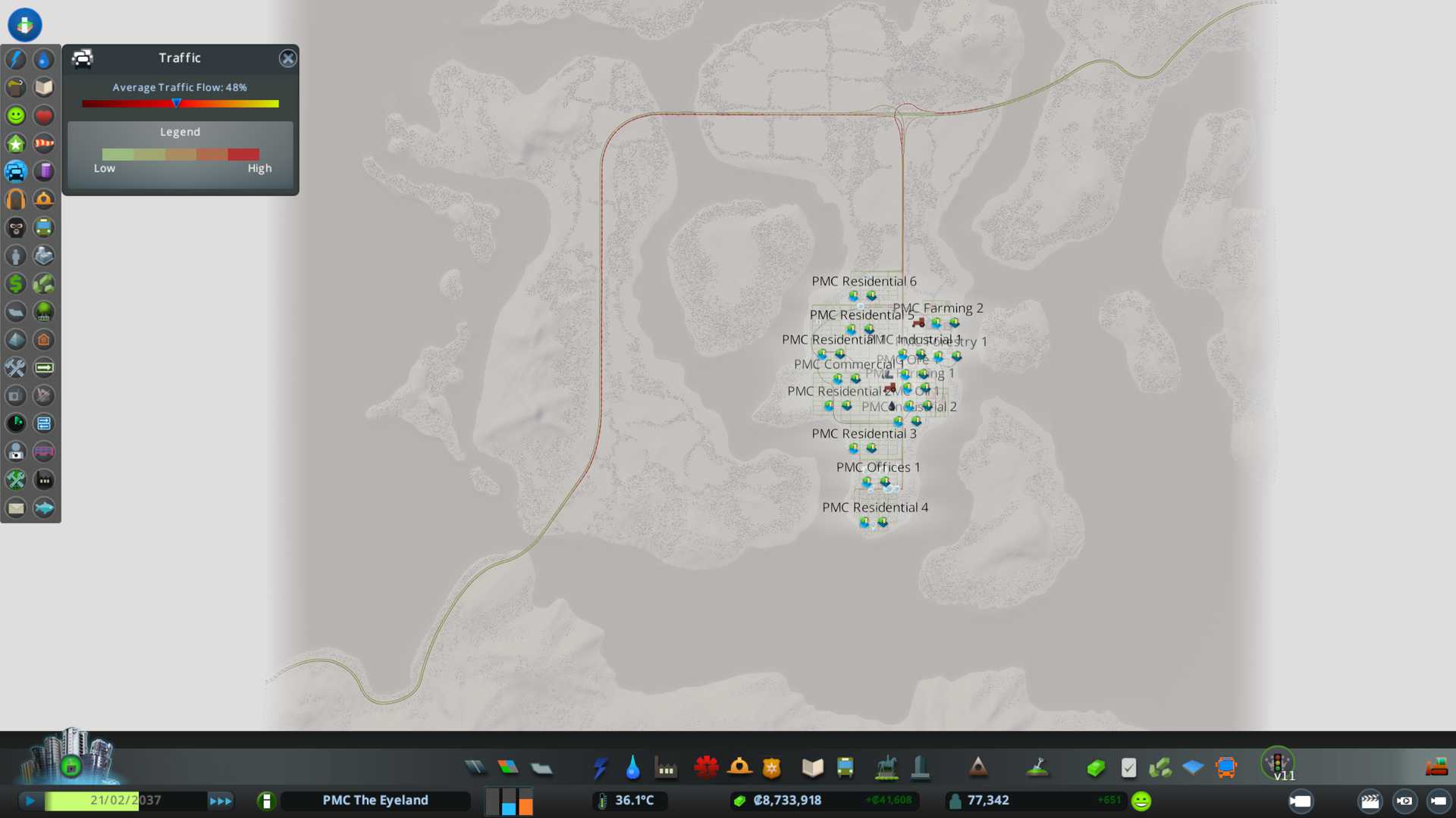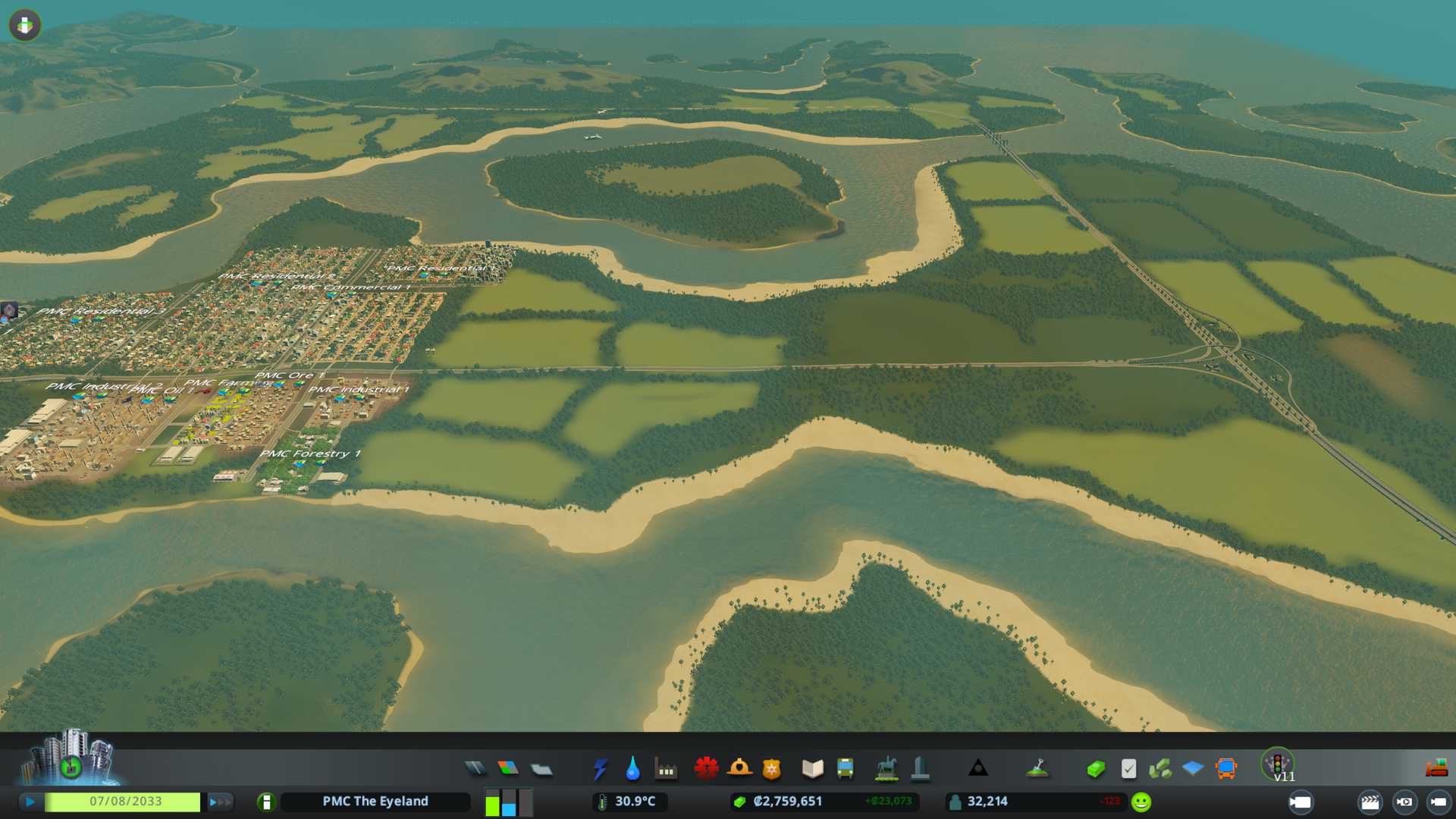 Switched this whole long highway part into six lane arterial road so I can link up collector roads to it along the narrow "peninsula" or whatever that land mass is. Currenly population 32k and expecting it to balloon to victory numbers once high density residentials are in place.